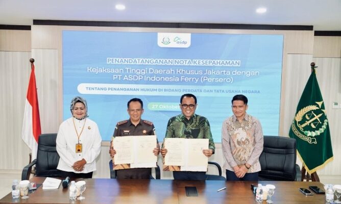 JAKARTA, AKSI KATA. COM – PT ASDP Indonesia Ferry (Persero) resmi menjalin kerja sama strategis dengan Kejaksaan Tinggi DKI Jakarta dalam bidang hukum perdata dan tata usaha negara. Sinergi ini ditandai dengan penandatanganan Memorandum of Understanding (MoU) pada Senin (27/10) di Gedung Kejaksaan Tinggi DKI Jakarta.