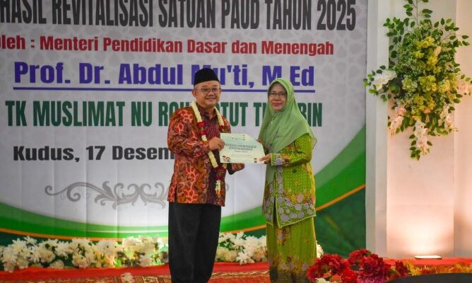 KUDUS, AKSI KATA. COM — Pemerintah terus memperkuat layanan pendidikan anak usia dini melalui program revitalisasi satuan pendidikan. Menteri Pendidikan Dasar dan Menengah (Mendikdasmen), Abdul Mu’ti, meresmikan hasil revitalisasi tahun 2025 untuk 10 satuan pendidikan di Kabupaten Kudus, Jawa Tengah. Salah satu sekolah yang diresmikan secara langsung dalam kunjungan kerja tersebut adalah TK Muslimat NU Roudlotut Tholibin.