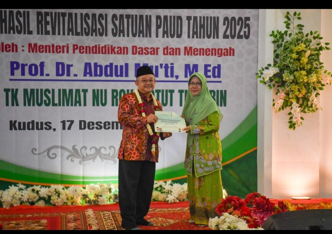 KUDUS, AKSI KATA. COM — Pemerintah terus memperkuat layanan pendidikan anak usia dini melalui program revitalisasi satuan pendidikan. Menteri Pendidikan Dasar dan Menengah (Mendikdasmen), Abdul Mu’ti, meresmikan hasil revitalisasi tahun 2025 untuk 10 satuan pendidikan di Kabupaten Kudus, Jawa Tengah. Salah satu sekolah yang diresmikan secara langsung dalam kunjungan kerja tersebut adalah TK Muslimat NU Roudlotut Tholibin.