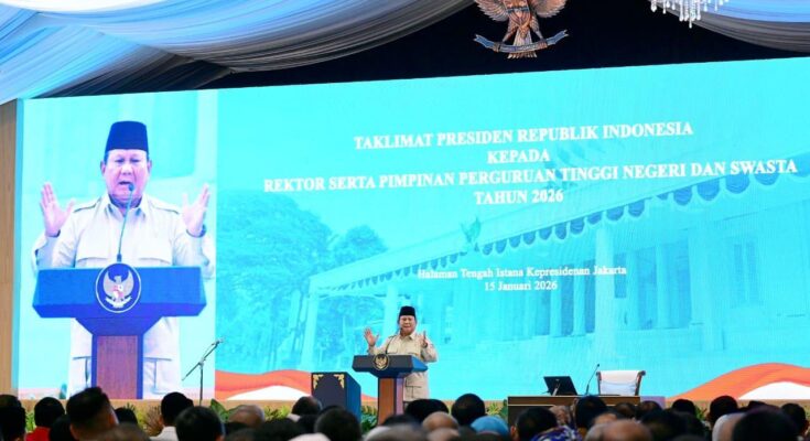 JAKARTA, AKSIKATA.COM – Presiden Prabowo Subianto mendorong perguruan tinggi di Indonesia untuk memperkuat riset dan inovasi yang berorientasi pada pembangunan industri nasional. Hal ini disampaikan dalam Taklimat Presiden Republik Indonesia bersama para rektor dan pimpinan perguruan tinggi negeri maupun swasta di Istana Kepresidenan Jakarta, Kamis, 15 Januari 2026.