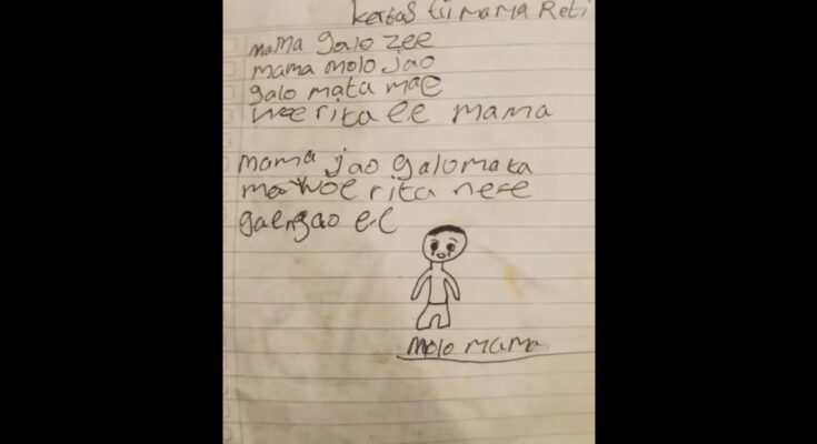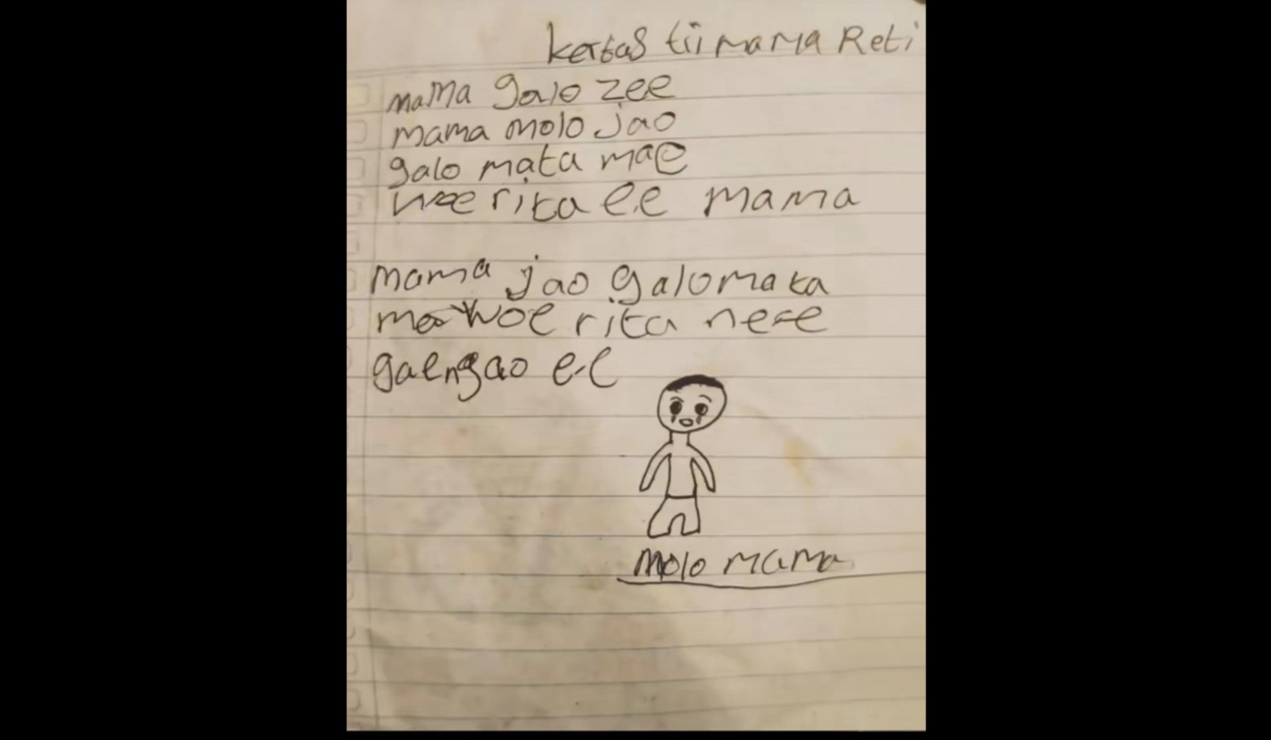 Surat yang ditulis di sebuah buku tulis itu memuat kalimat sederhana dengan gaya bahasa anak-anak. Di bagian akhir, terdapat tulisan “molo mama” yang berarti “selamat tinggal mama” dalam bahasa daerah setempat. Surat tersebut juga disertai gambar sederhana seorang anak yang tersenyum.