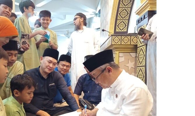 Usai shalat Tarawih Abdul Mu’ti dikerumuni murid-murid yang antri minta tanda tangan tugas sekolah dari Pak Menteri Pendidikan Dasar dan Menengah.