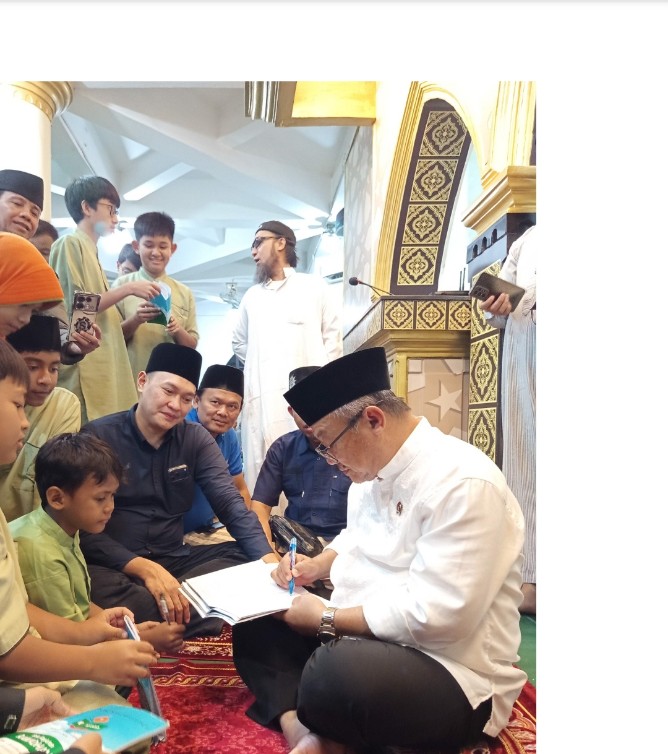 Usai shalat Tarawih Abdul Mu’ti dikerumuni murid-murid yang antri minta tanda tangan tugas sekolah dari Pak Menteri Pendidikan Dasar dan Menengah.