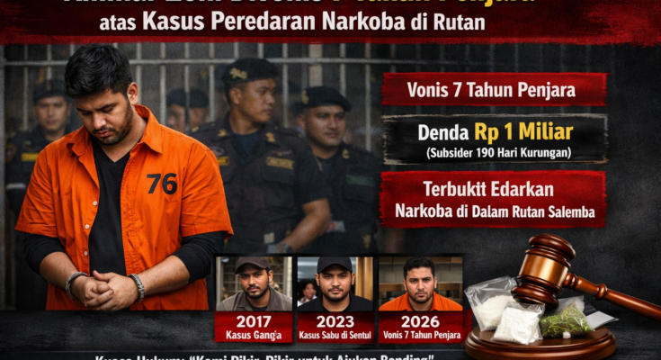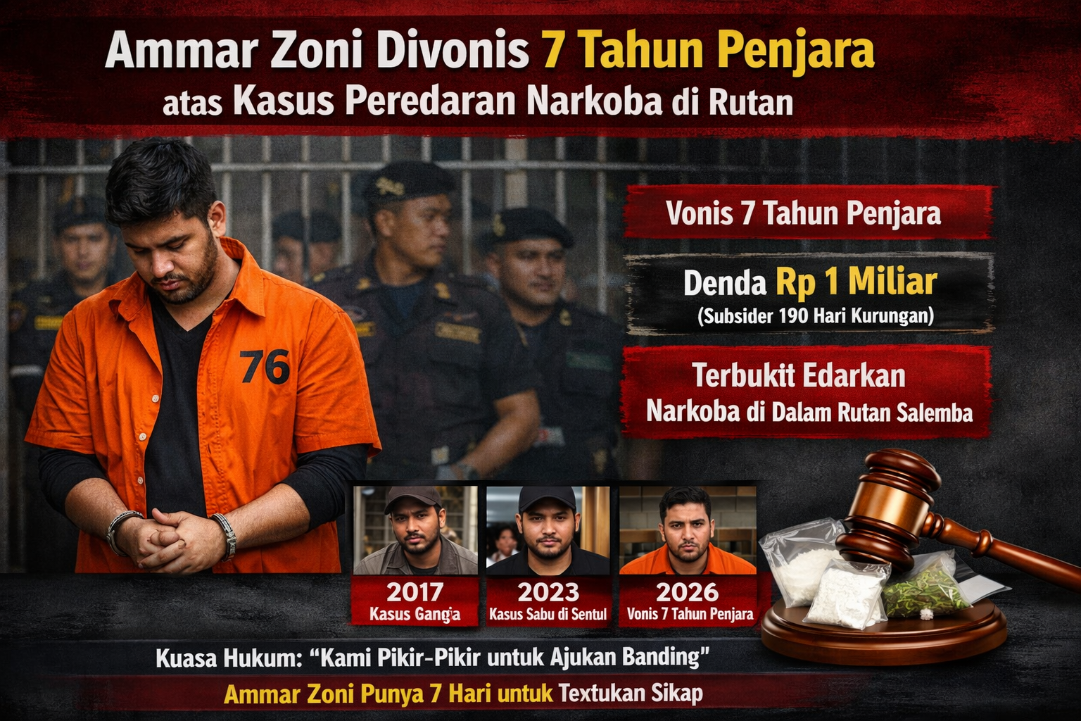 JAKARTA, AKSIKATA.COM – Aktor Muhammad Ammar Akbar alias Ammar Zoni resmi divonis tujuh tahun penjara oleh Majelis Hakim Pengadilan Negeri Jakarta Pusat pada Kamis (23/4/2026). Selain hukuman badan, Ammar juga diwajibkan membayar denda sebesar Rp1 miliar, dengan ketentuan subsider 190 hari kurungan apabila tidak dibayar.